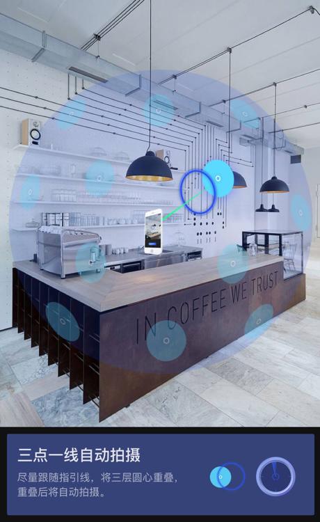 進(jìn)入如視VR APP的操作界面,用戶可根據(jù)自身需求,在操作界面自行選擇一個(gè)合適的定位進(jìn)行拍攝。根據(jù)這一定位,如視以AR輔助,引導(dǎo)用戶通過(guò)三點(diǎn)一線的“瞄準(zhǔn)層”進(jìn)行24個(gè)點(diǎn)位的固定畫面采集。用戶僅需保持相機(jī)位置不變,調(diào)整角度,即可快速完成畫面采集,整個(gè)過(guò)程不超過(guò)2分鐘。